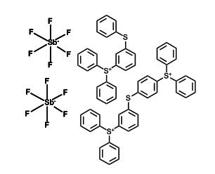 中文別名:二[4-(二苯基锍)苯基]硫醚二(六氟銻酸鹽)與二苯基[4-(苯硫基)苯基]锍六氟銻酸鹽的混合物